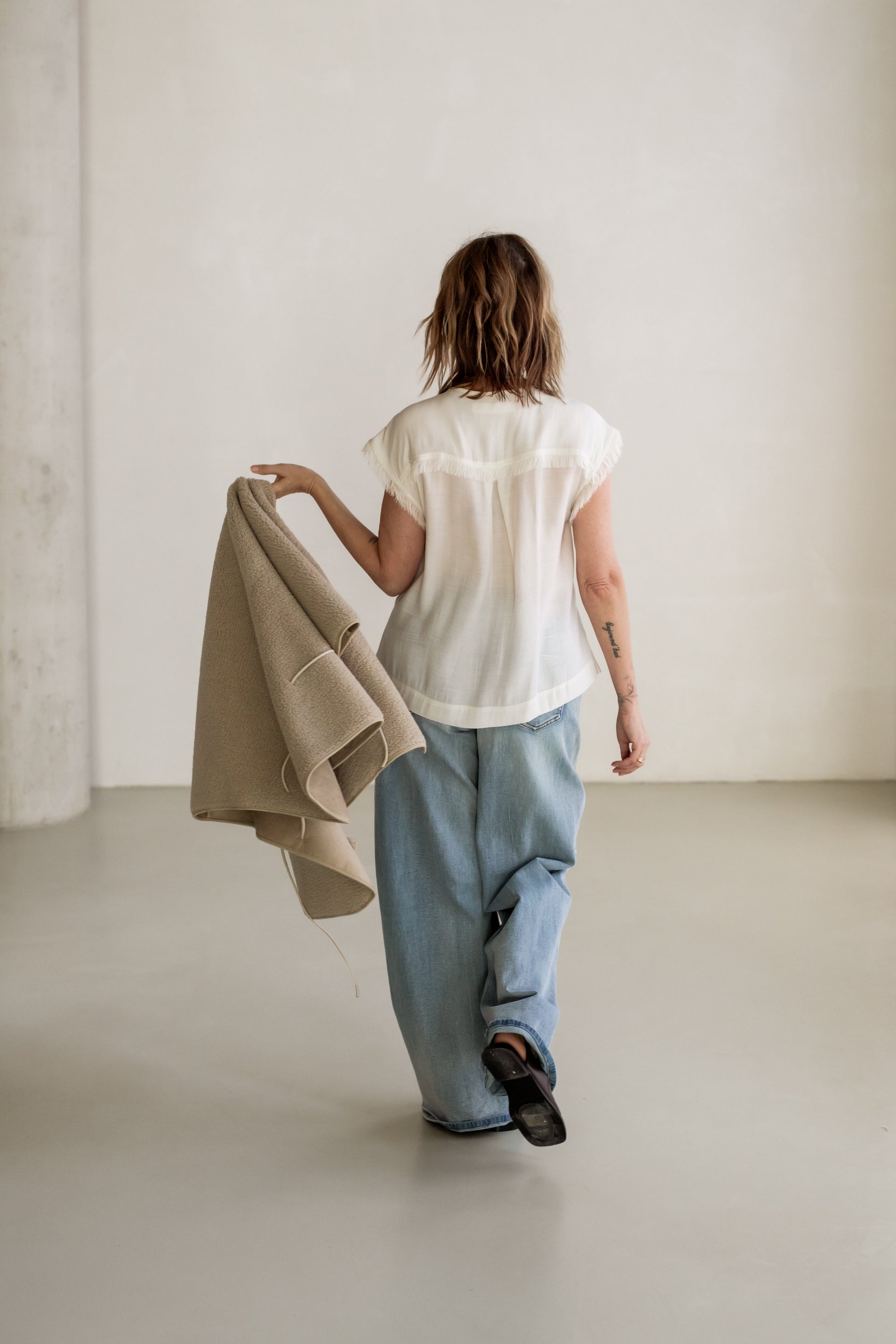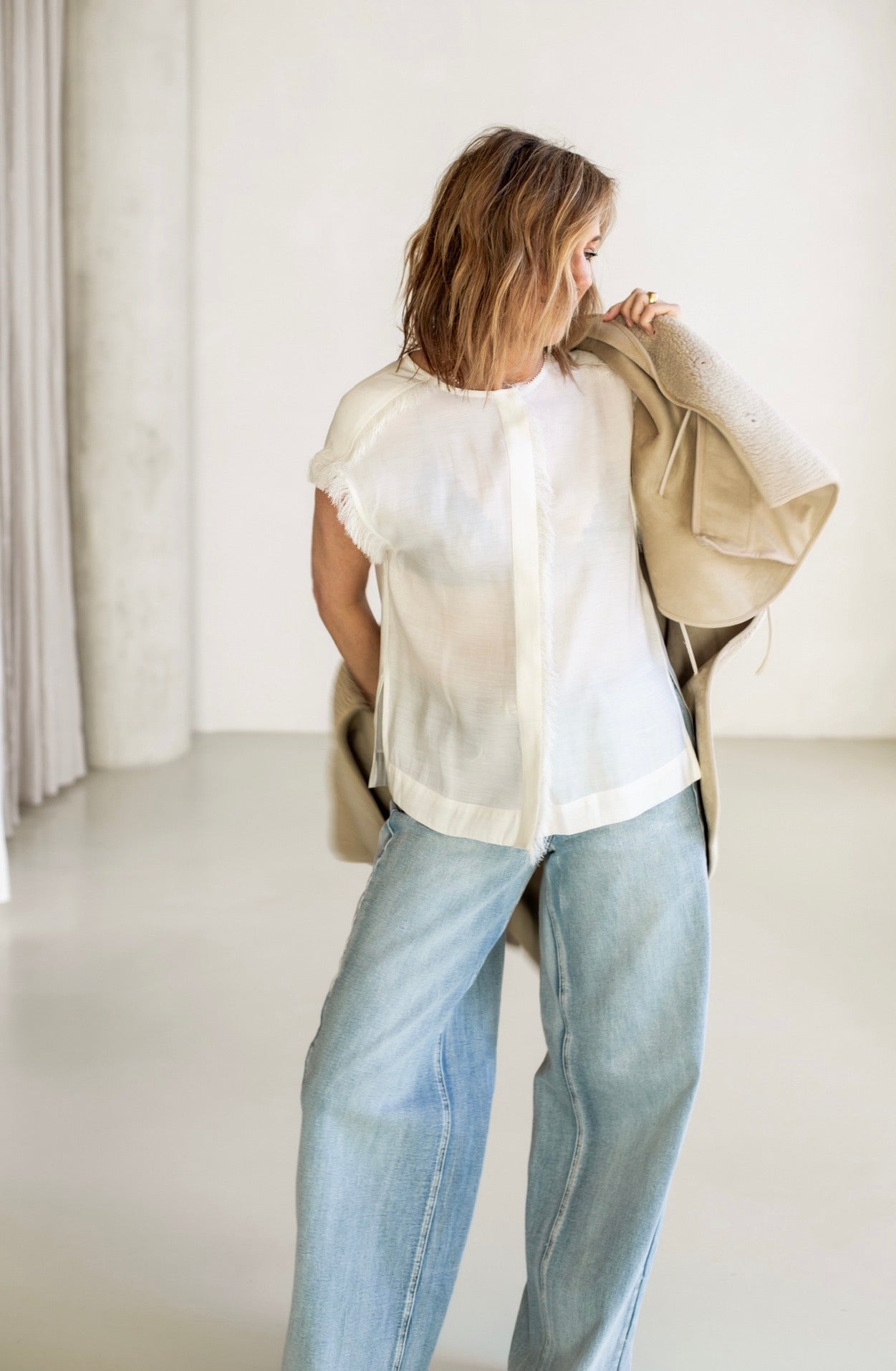 Deze losse, mouwloze top met knoopjes heeft franjes op de schouders en de knoopsluiting. De top is semi-transparant. Draag hem in een A-lijn rok voor een evenwichtige look.