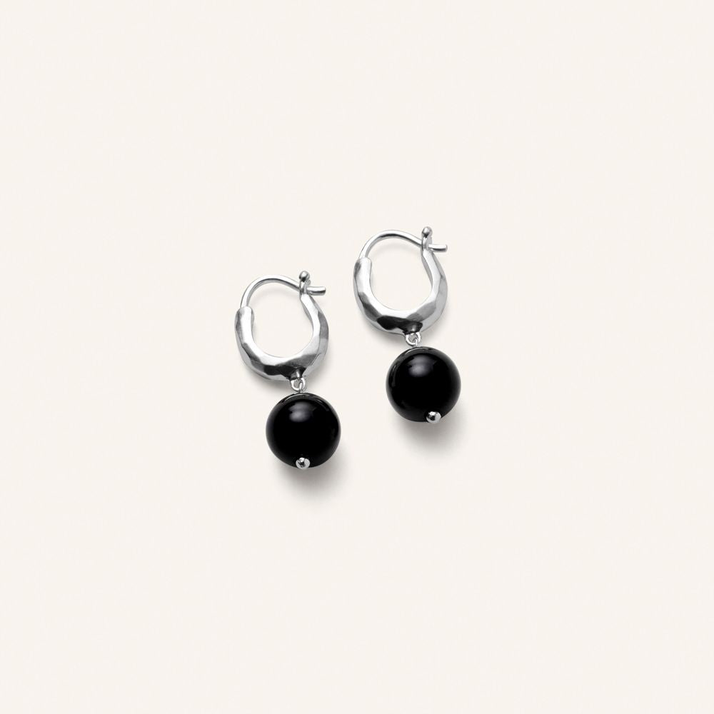 Een zwarte onyxsteen bungelt sierlijk aan de ring, net onder de oorlel, en beweegt speels met elke beweging.